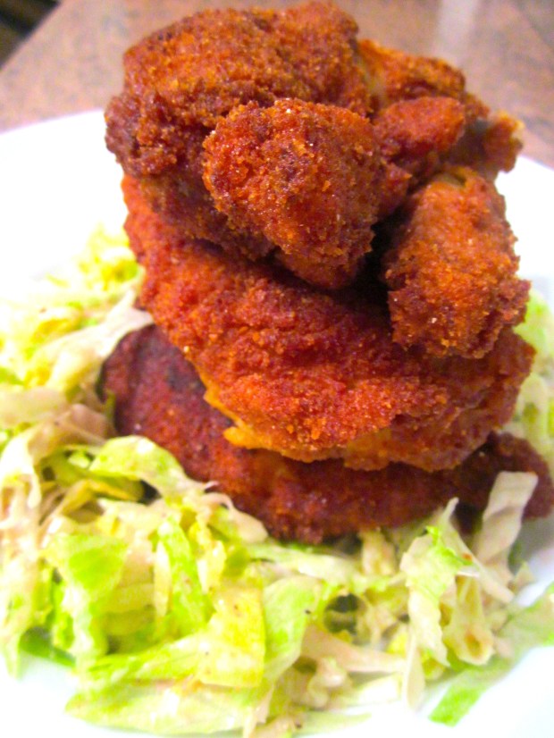 Fry the cornish hen at 375 F until very crispy and cooked through. Remove to absorbent paper. Drizzle with chili oil.
