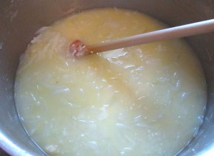 - remove the rind from 12 oc of Gruyère cheese, add to the soup