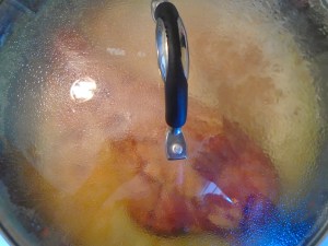 - add 3 tblsp curry powder, 1 tsp granulated garlic, 1 tsp cumin, a pinch of grated ginger,1 tblsp garam masala and kosher salt to taste, leftover cooked chicken, about 1 leg or one breast per person (this was a whole chicken, so this whole dish will serve 4) ,saute until fragrant