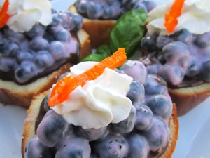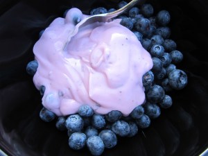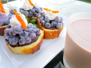 Fresh blueberries, blueberry yogurt, pound cake, dried apricots, whipping cream and chocolate sauce.