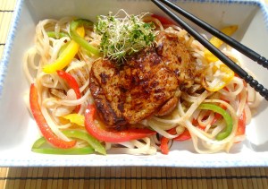 However, if you only like your chicken skin crisp, this preparation might not be for you. But if on the other hand you do like the texture of a braised chicken skin (think coq au vin as a reference) and if you love the braising liquid/sauce from a well-seasoned braised dish (again, think of the great sauce a coq au vin will provide), this “Braised Teriyaki Chicken With Spicy Rice Sticks” will make you happy. The additional sauce from the chicken provides a wonderful coating to the already flavorful rice sticks.