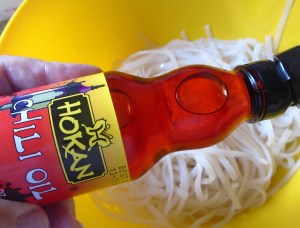 - drain rice sticks, toss with 1 tblsp chili oil and 1 tblsp sesame oil