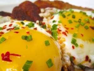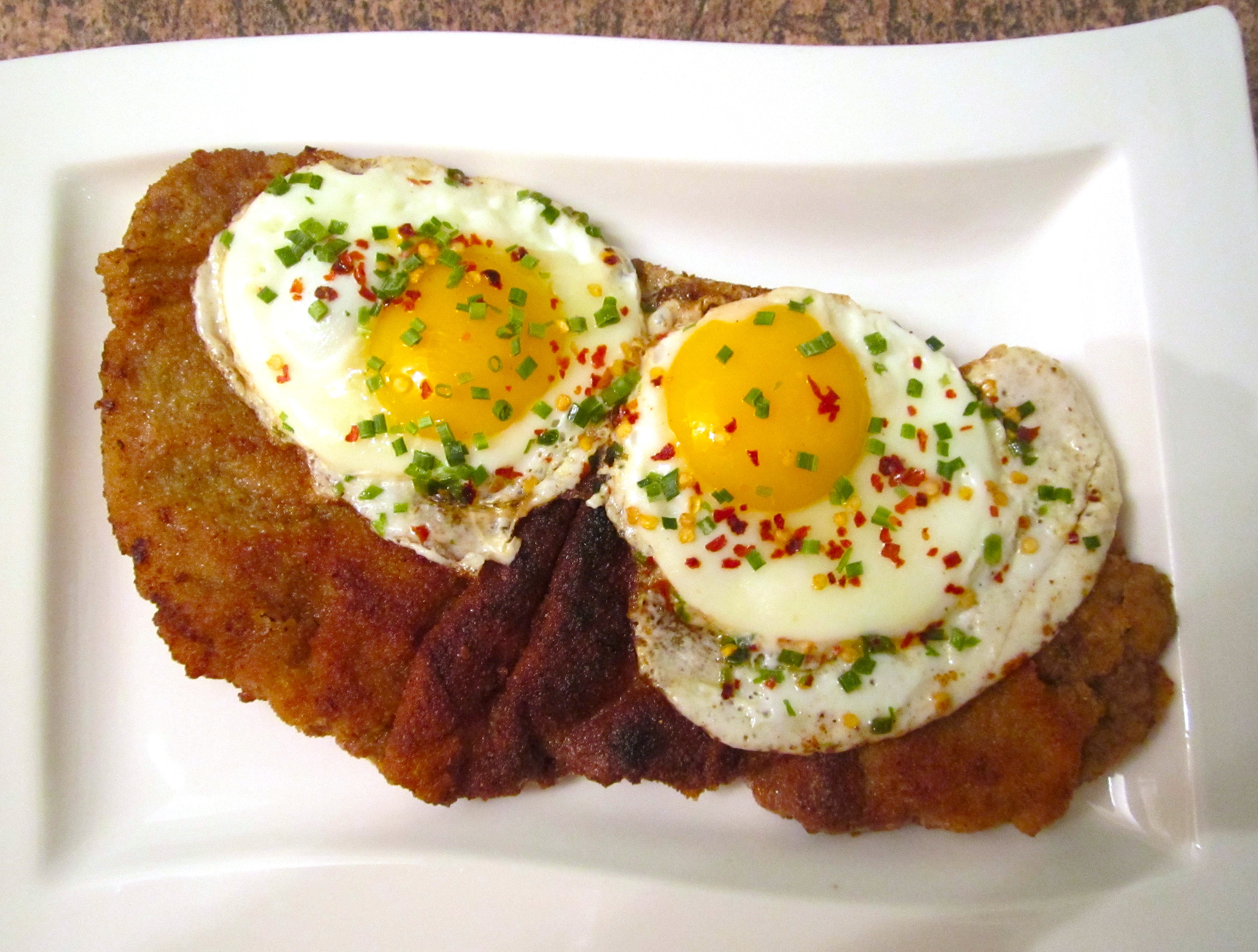 - BREADED CHICKEN SANDWICH WITH GUACAMOLE, SWEET CHILI RELISH & FRIED EGG, ACCOMPANIED BY HUMMUS AND SMALL SALAD