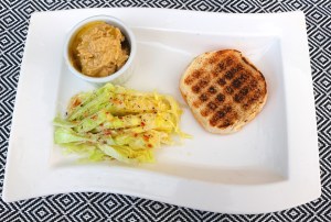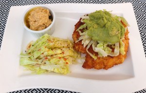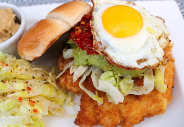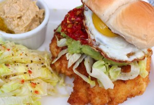 BREADED CHICKEN SANDWICH WITH GUACAMOLE, SWEET CHILI RELISH & FRIED EGG, ACCOMPANIED BY HUMMUS AND SMALL SALAD