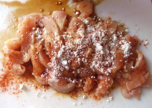 - slice 2 med-size chicken breasts into slices, season with 1 tsp garlic paste, fresh-cracked black pepper and kosher salt to taste