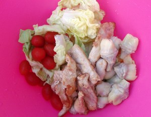 - to 1 large butter lettuce add the chicken, 1 cup grape tomatoes, 1 8 oz can drained artichoke hearts and vinaigrette to taste, mix
