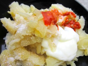 - add plenty of butter, sriracha, garlic paste, greek yogurt and kosher salt to potatoes