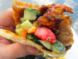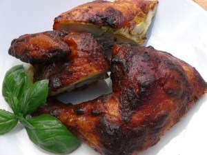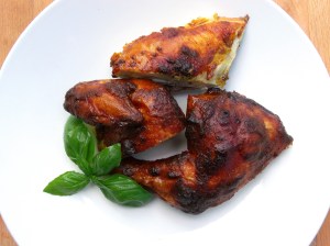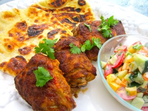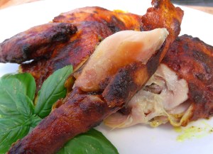 Tandoori Chicken is one of the most popular dishes from northern India. It is grilled chicken rubbed with a blended spice marinade, identifiable by its red coloring. Tandoori is Indian style of BBQ. The marinade has garlic, salt, coriander, tamarind, cumin, ginger, lentils, and oil.