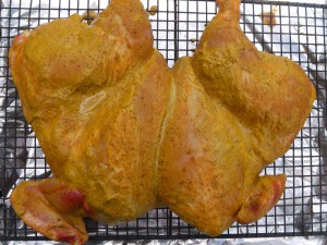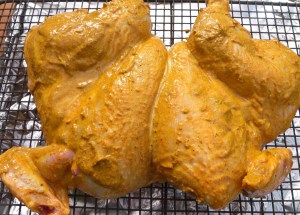 Place in a bowl, cover and refrigerate 24 hours When ready to cook, preheat broiler on low. Once the temperature is attained, place the chicken pieces on a rack with a drip pan under it. Broil on low for 30 minutes, turning the chicken once. Then turn the broiler to high and cook for another 15 minutes, turning once so that the chicken is crisp on both sides. You will see that the marinade will start to dry up and the chicken will start getting a crust. Remove from oven and transfer to a plate. Serve immediately with naan, sliced onions, quartered lemons, chopped cilantro and mint chutney or condiments of your choice (or follow the suggestion on this page)