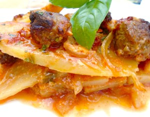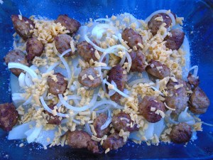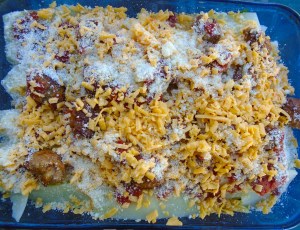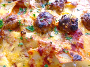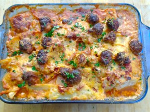 Although not real meatballs (I used spicy Italian sausage) nor real lasagna (which by definition contains sheets of pasta) nor ricotta (I used cheddar instead), this dish knocked it out of the park and although I am a certified pasta lover, I would substitute this one for a real lasagna at any time, hands down 🙂
