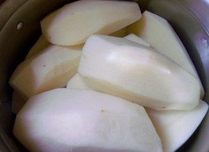 - simmer 4 ea baking potatoes, peeled and halved, in lightly salted water for 15 minutes (potatoes will not be fully cooked), drain