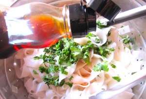Glass noodles are the ideal canvas for pasta salad. They keep their texture even when kept as leftovers for a few days, which is perfect when you live alone and usually cook way too much for one meal, (as I do), even with a dog who will eat it’s fair share of whatever I cook 🙂