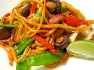 Pasta, cooked, strained, mixed with 1 tsp sesame oil
