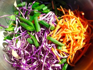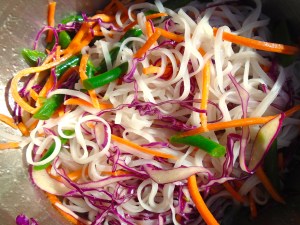 Glass noodles are the ideal canvas for pasta salad. They keep their texture even when kept as leftovers for a few days, which is perfect when you live alone and usually cook way too much for one meal, (as I do), even with a dog who will eat it’s fair share of whatever I cook 🙂