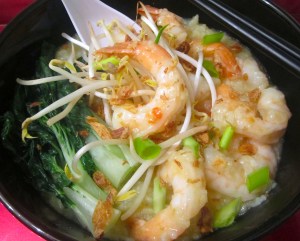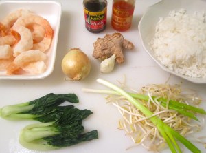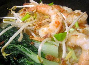 Simmer rice with in stock, salt and pepper until a porridge like texture is achieved. In the meantime, fry onions and garlic separately until golden. Remove to absorbent paper. Reserve. Saute Shrimp, garlic paste and grated ginger until fragrant and shrimp about halfway cooked. When congee has reached the desired texture, add the shrimp, bock choy and scallions, simmer until heated through, about one minute. Adjust seasoning if necessary. To plate, drizzle with sesame oil and chili oil, sprinkle with fried onions, fried garlic, bean sprouts and scallions.