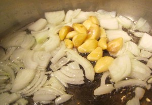- saute 1 ea large diced onion and 9 ea whole garlic cloves (confit) in 4 tblsp olive oil