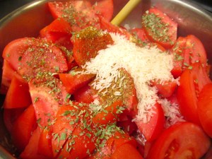 - add 2 cup tomato sauce, 1 tblsp chopped toasted almonds, 1 tblsp chili flakes, 2 tblsp sweet Spanish paprika and a few threads of saffron