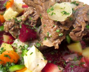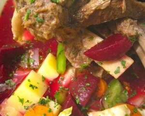 - cook the beets in lightly salted water until soft but NOT mushy, remove from stock, peel, dice