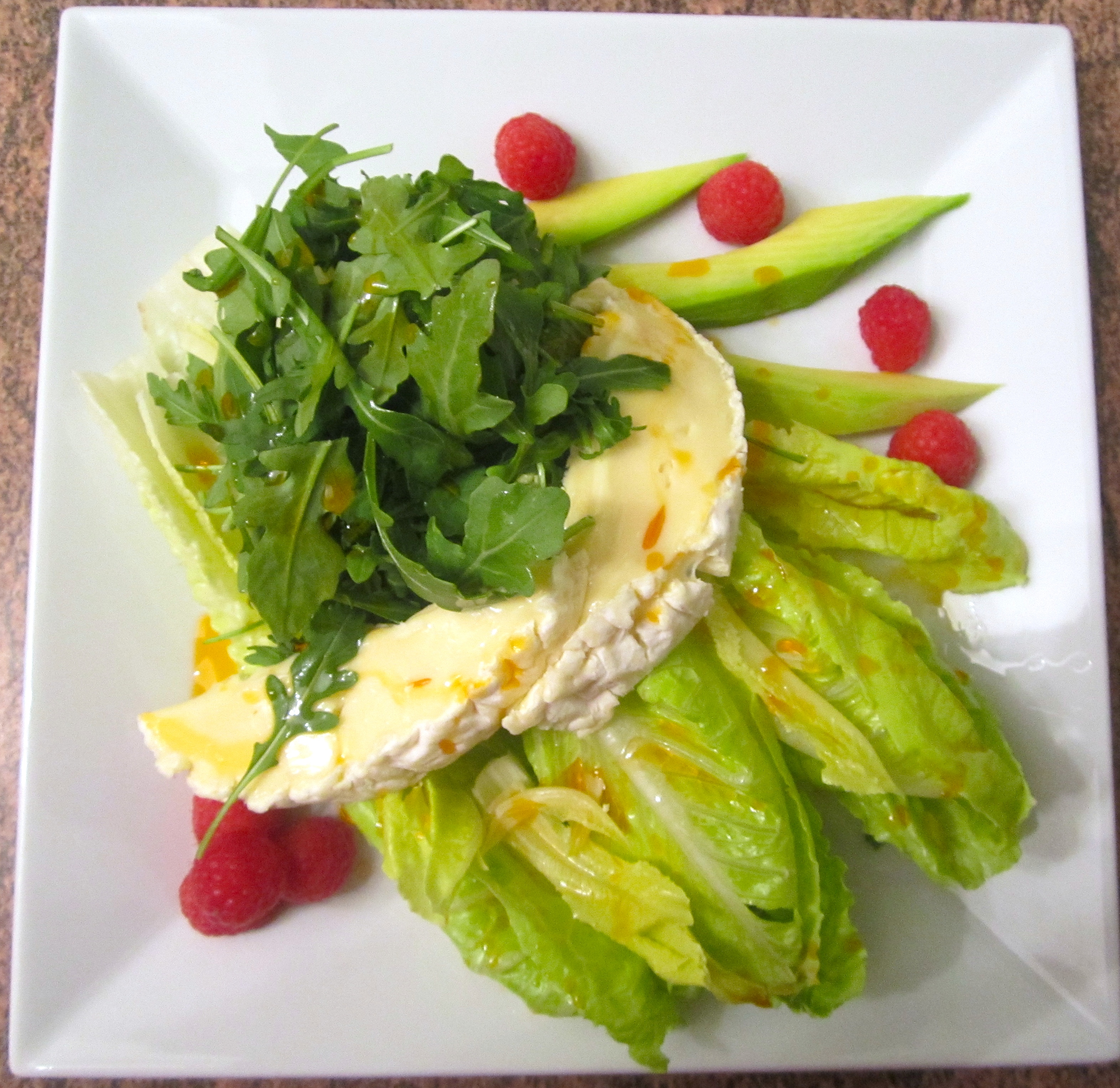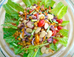 - add octopus salad, drizzle dressing from octopus salad all over romaine leaves, sprinkle with honey roasted corn kernels for crunch and additional flavor