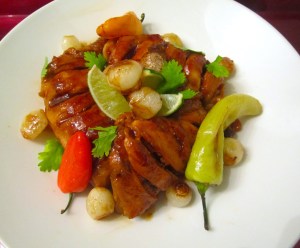 Season chicken with salt and black pepper and saute until golden brown on both sides. Remove onto absorbent paper. Saute pearl onions and chilies. Remove to absorbent paper. Saute sliced onions, garlic and ginger until translucent. Add vinegar, caramel, and all seasoning. Add chicken and slowly simmer until chicken is cooked through and sauce has reduced enough to cover the chicken. If the sauce becomes too thick before he chicken is cooked all the way, add a bit of water. If the sauce is too thin when the chicken is done, remove chicken and reduce until desired texture is achieved. At this point, strain the sauce if you like it smooth, otherwise, serve it more rustic with all the bits and pieces still in the sauce. Now, return the chicken, whole chiles and pearl onions. Simmer for another minute while basting the chicken to make sure it is well covered in sauce. To serve, add chicken to plate, cover with remaining sauce, top with chilis, onions, cilantro and lime wedges.