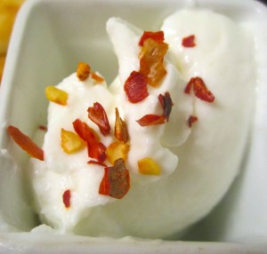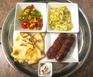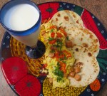 The Turkish flatbread came out of our neighborhoods Turkish bakers oven just about 30 minutes earlier (he delivers) ; the eggs are fresh from my neighbor’s hens, and the tomatoes, green chilies, cucumbers and scallions come from the farms in the immediate area.