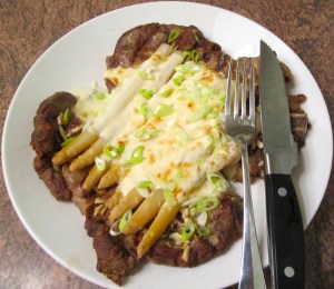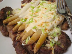 Season steaks with sea salt and freshly ground black pepper. Season yoghurt with sea salt and cayenne pepper, mix with some grated asiago cheese. Season asparagus with sea salt and cayenne pepper. Grill steak until medium well. (It will continue cooking to well done while it gratinates). Place steak on baking dish, sprinkle with freshly grated horse radish. Top with asparagus. Brush asparagus tips with melted butter. Nape asparagus with yoghurt, sprinkle with asiago cheese and scallions. Gratinate until golden.