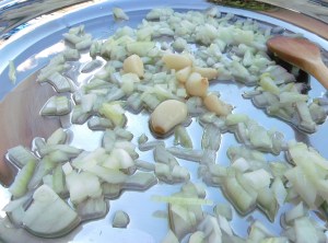 - saute 1 ea large diced onion and 9 ea whole garlic cloves (confit) in 4 tblsp olive oil