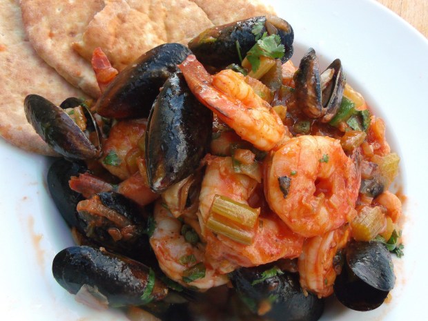 - bring stew to a simmer, turn off heat, cover and let steep for 5 minutes, check, adjust seasoning, remove and discard any unopened mussels, sprinkle with more chopped parsley and small capers; serve with pita bread or grilled sour dough bread, serves 2