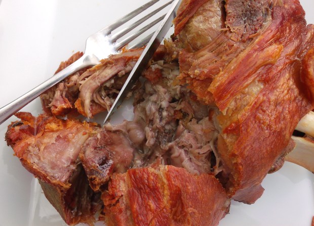 ” I want to make the case that pigs’ tails contain everything desirable in the pig, and in exactly the right proportions. Unlike ox tail, the tails of pigs come with the skin intact so that each segment is a perfect cross-section of skin, fat, tendon, and meat.