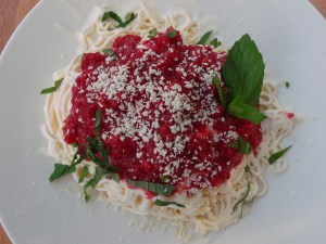 - saute julienne of one medium size onion in 3 tblsp olive oil until translucent, add 1 tblsp garlic paste