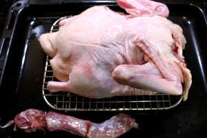 place on a rack over a rimmed tray (to catch the fat and juices, place into a 400F (205 C) degree oven, turn down temperature to 300F (150C), roast for 3 Hours/45 Minutes, turning every 30 Minutes
