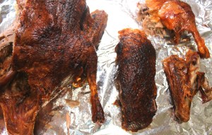 after 3 H/45 M, turn the temperature to 420F (215 C) remove the duck with the rack to another tray (I used a cast Iron pan) roast breast-side up for another 20 to 30 minutes or until the skin is very crisp and golden brown, remove from oven and let rest for 10 Minutes before carving