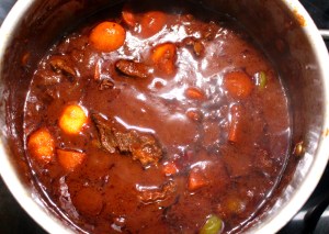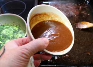 add 2 cups good quality red wine, simmer until all the fond has loosened from the bottom of the tray