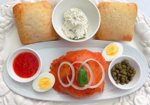 - for these sandwiches, I used ciabatta rolls, herb and garlic boursin, hard boiled egg, capers, sliced onions and sweet chilli sauce; usually I use dill/mustard sauce with gravlax, but the ciabatta rolls are pretty rustic and can do with a bit of spice