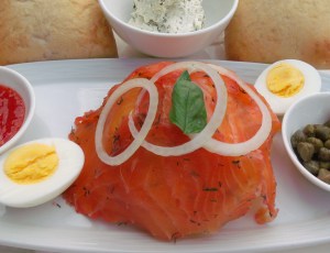 - add the salmon and onions (for a prettier presentation put the egg and capers together with the onions on top of the salmon, however, the way I did it here will keep the capers and egg from rolling off when you eat the sandwich)
