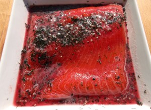 - 2 lbs skin on raw salmon, 2 cup kosher salt 1 cup granulated sugar 2 jigger vodka 1/2 cup sliced dill leaves plus 1/4 cup 1/2 cup red beet juice 2 tblsp dijon mustard 1 tblsp fresh-cracked black pepper